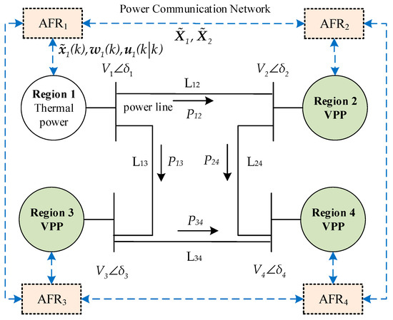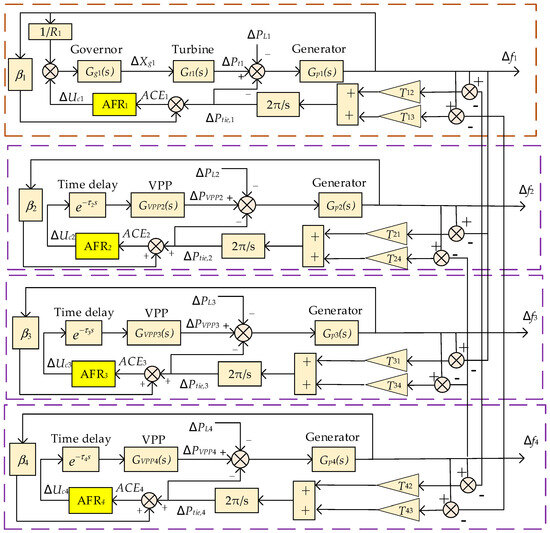 Based on the Matlab2020a platform, a four-area interconnected power system model is constructed as shown in Figure 4, and the specific model structure is shown in Figure 5. In the figure, area 1 utilizes thermal power for FR, the other three areas utilize VPP for FR. There exist tie lines and dedicated power communication networks between neighboring areas for power transmission and information interaction. The parameters of the power–frequency model of the zonal system are detailed in Table 1.