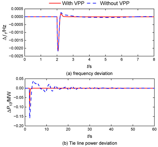 This section compares and analyzes the system frequency modulation effect before and after VPP participation in AFR. The response delay of VPP (τ = 0 s) is ignored for the time being, and the DMPC controller is used in all regions. The comparison curves of the amount of change in system frequency and tie line power before and after the VPP introduction are shown in Figure 6 and Figure 7.
