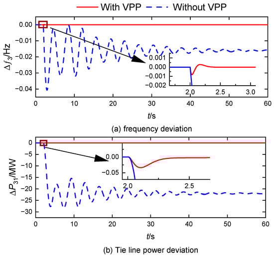 In the case of a step disturbance of the same amplitude occurring in area 3, where VPP is actively participating in the AFR, as shown in Figure 6, the fluctuations in both system frequency and tie line power are again quickly dampened post-VPP participation. Additionally, this participation ensures that both the grid frequency deviation and the inter-area tie line power are restored to zero. In contrast, if the VPP does not engage in AFR—relying solely on the thermal power units in area 1—the ACE control mode necessitates that load power fluctuations in Area 3 are compensated by increments in the inter-area tie line power. This can ultimately hinder the system’s ability to achieve a zero differential regulation of the frequency.