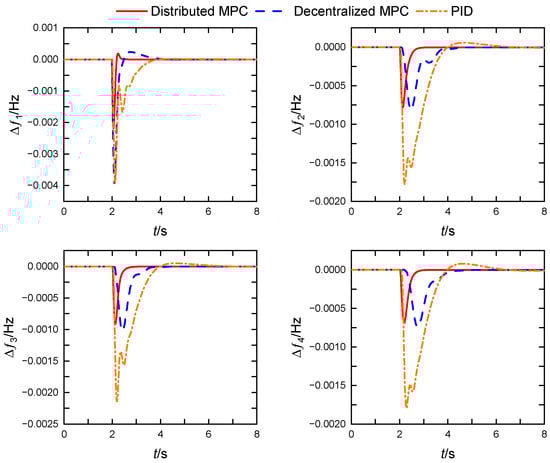 In this scenario, we discuss the frequency response performance of distributed MPC, decentralized MPC, and PID. It is assumed that the FR resources of all four partitions participate in the AFR time while ignoring the communication delay of the VPP response (τ = 0). When a step disturbance of 0.01 p.u. occurs in area 1, the results shown in Figure 8 and summarized in Table 3 indicate that traditional PID control, constrained by fixed parameters, performs significantly worse than both decentralized MPC and distributed MPC in terms of FR effects. The decentralized MPC neglects the coupling between adjacent subsystems during its modeling, leading to greater overshooting and longer regulation times compared to the distributed MPC.