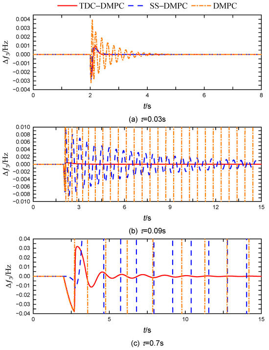 When a step perturbation with an amplitude of 0.01 p.u. occurs in the load in area 3, the frequency regulation effects of the three DMPCs under varying delays τ are presented in Figure 9, with quantitative analysis results detailed in Table 4.