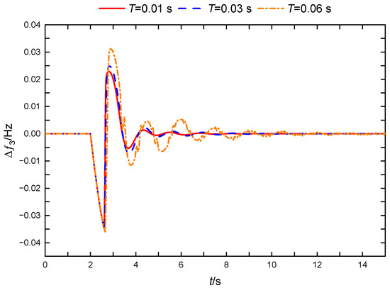 Comparison of frequency deviation in area 3 under different sampling periods T (τ = 0.6 s).