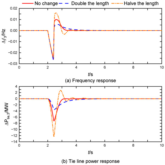 As the inter-district tie line length decreases, the coupling between the interconnected grids increases, which complicates the frequency regulation and control efforts. The TDC-DMPC control effect under different tie line lengths is shown in Figure 11 and the corresponding synchronization coefficients are shown in Table 6. As can be seen from the graph, the longer the distance between zones, the better the control effect of TDC-DMPC. Under a certain transmission power Pij of the tie line, the longer the length of the tie line Lij, the larger the power angle difference between the regions Δδij. According to Equation (6), the synchronization coefficient Tij becomes smaller as Δδij becomes smaller, which leads to weaker coupling between areas. The decrease in coupling in the interconnection region directly leads to a smaller power variation of the tie line Pij in disturbed area 3, which reduces the corresponding overshoot. This shows that the TDC-DMPC proposed in this paper can maintain a good control effect under different tie line lengths.