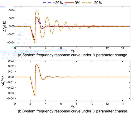 To evaluate the impact of possible deviations in system model parameters on the transient frequency regulation performance, we specifically analyze two key parameters: the inertia coefficient H and the damping coefficient D. The results of this analysis are depicted in Figure 12.