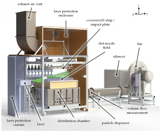 The test rig for concluding the heat transfer of industrial nozzle systems by determining both the heat transfer coefficient and the flow visualisation is shown in Figure 2. The test rig is based on a radial fan with a power of 90 kWel and a maximum volume flow rate of 10,800 m3/h.