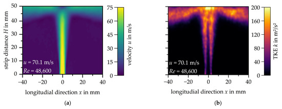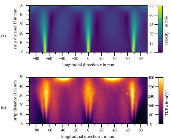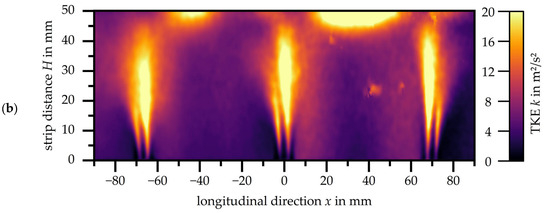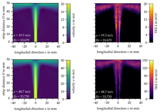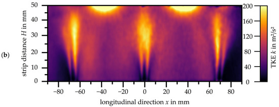 Initially, the flow through a single slot nozzle with a strip distance of H = 50 mm is analysed at different nozzle exit velocities. Figure 4a shows the velocity distributions for the three different exit velocities, while Figure 4b illustrates the corresponding distributions of turbulent kinetic energy. Note that the scales had to be adapted to the increasing exit velocity. A uniform scaling across all velocities leads to reduced contrast, resulting in reduced readability of the measured data.