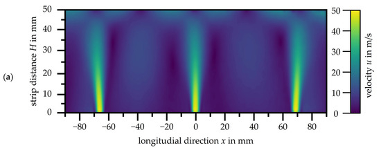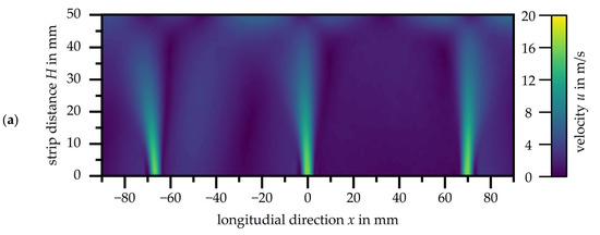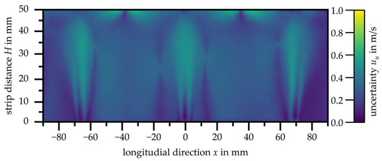 Figure 9 presents the measurement uncertainty uu of the velocity distribution of the slot nozzle array with a nozzle exit velocity of u = 48.7 m/s, given in m/s. As with the single nozzle, the accuracy of the PIV in pixels is less than 0.1 px.