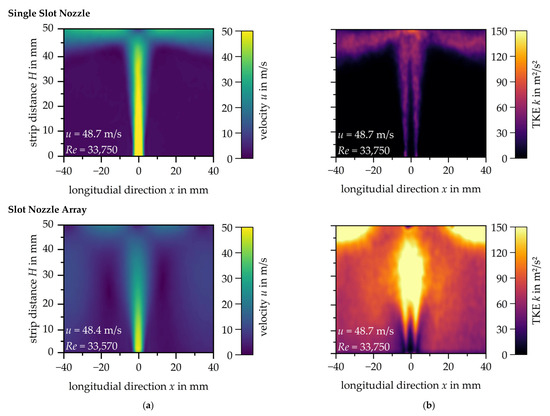 The results for the single slot nozzle show that the formation of the characteristic flow pattern is independent from the nozzle exit velocity leading to an increase in the mean velocity of the impingement jet. The same applies to the turbulent kinetic energy distribution. The turbulent kinetic energy increases reciprocal to the increase in velocity. The same was observed when analysing the slot nozzle array. Furthermore, it can be seen that the velocity in the mixing zone increases with increasing nozzle exit velocity, which leads to a higher turbulent kinetic energy. Figure 10 compares the results of the single slot nozzle and the slot nozzle array at a nozzle exit velocity of u ≈ 48.5 m/s. The central slot nozzle of the slot nozzle array has been selected for this comparison.