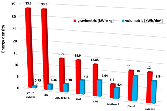 Gravimetric and volumetric energy density of selected motor fuels [6].