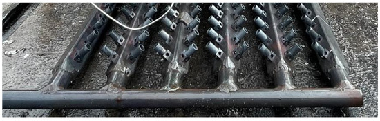 According to the cylinder definition [21], a 320 mm-diameter cylinder, similar to that used in vehicle fire tests, should be used for the initial burner test. The cylinder length must be at least 800 mm and the total length should not exceed the maximum length of the engulfing burner. A 320 mm-diameter and 1600 mm-long chrome molybdenum steel cylinder was used in the presented test. The location of the cylinder in relation to the burner is shown in Figure 4. The stand supports ensure the required distance of the lower wall of the cylinder from the burner. The required position of the thermocouples measuring the flame temperature is ensured by special brackets integrated with the burner. The arrangement of thermocouples on the stand is shown in Figure 5. The marking of thermocouples and their arrangement at all measuring points on the truss (Figure 6) was performed in accordance with the recommended requirements [21].