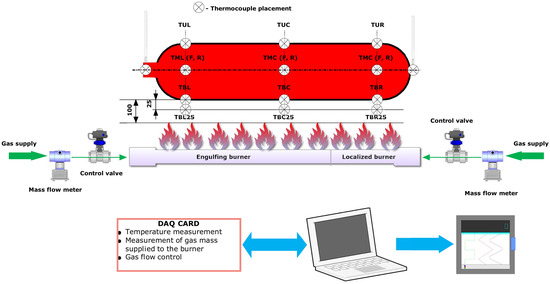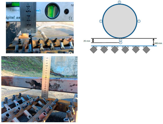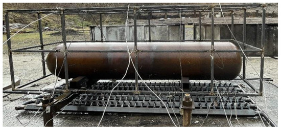 - The steel cylinder was placed horizontally so its lower surface was 100 ± 5 mm above the fire source. Then, all the thermocouples were placed, as shown in Figure 8. The thermocouple system was mechanically supported to prevent the thermocouples from changing position during temperature measurement.
