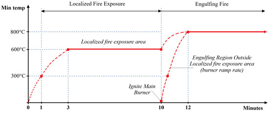 The test consists of two stages: a localized fire stage followed by an engulfing stage, as described in Figure 7. In the first one, a limited, localized fire affects the tank. After 10 min, an additional burner is turned on, providing an engulfing fire.