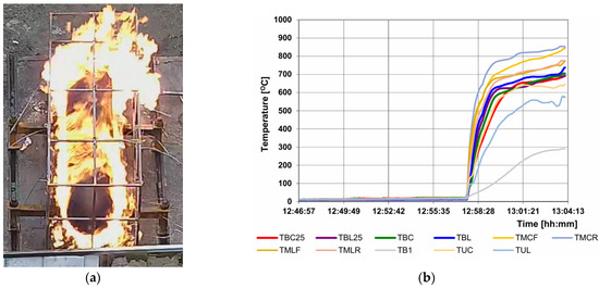 Test progress in the engulfing fire phase: (a) flame impact zone on the tank; (b) measurement results of the selected thermocouples, important for this stage.