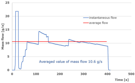 During the pre-test, the basic control parameter is the amount of gas supplying the burners in the individual stages. The basis for the control are the values suggested in the R134 regulation. The range of changes in the gas flow rate was calculated so that each of the burners would provide the required heating power. The gas flow to the burners is continuously monitored during the test. The measurement was performed separately for each burner by flow meters installed at the outlet of the collectors supplying the burners. The recorded results are presented in the graph (Figure 10). In assessing the correctness of control, the average value of the gas mass flow is taken into account (Figure 11).