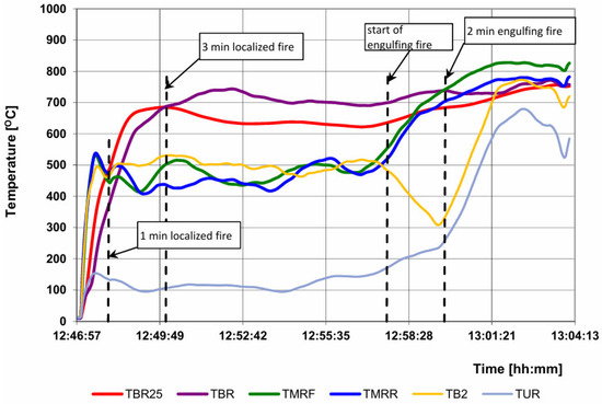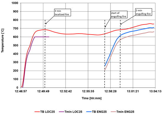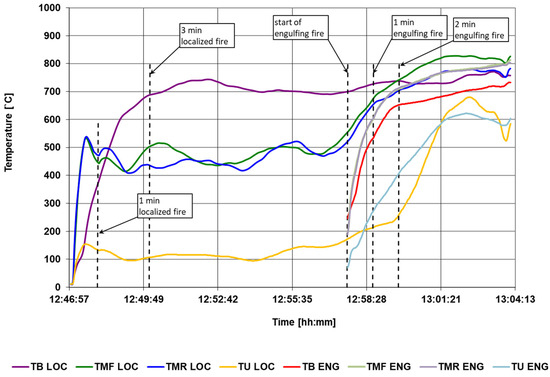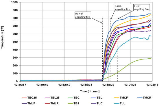 The purpose of the pre-test is to verify that the localized and engulfing burner zones provide the required amount of energy during tests performed on tanks filled with hydrogen to 100% and that the test stand configuration (with a wind shield) is functional and allows for the provision of repeatable results. The pre-test must be repeated each time any of the stand elements affecting the thermal parameters of the heat flow supplied to the tank have been changed. Figure 8 shows the results of the required temperature measurements in the localized fire phase. The image on the left shows the area affected by the flame in this test phase. Figure 9 refers to the engulfing fire phase. In this phase, the second burner is started 10 min after the start of the test. Then, the entire tank is exposed to the fire, or a 1.65 m section if the tank is longer than the burner.