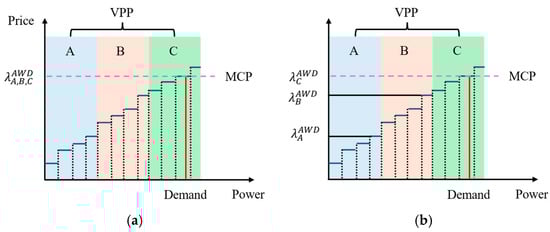 In a PAC auction, all successful bidders receive the MCP, which is set by the highest accepted bid that meets market demand. The auction process begins with generators submitting bids specifying their desired price and corresponding power quantity. The market operator ranks these bids in ascending order and accepts them sequentially until the total demand is met. The price of the marginal bid, i.e., the last accepted bid, determines the MCP. Under this mechanism, all accepted bidders receive a uniform MCP, regardless of their individual bid prices. As illustrated in Figure 1a, VPPs A, B, and C are awarded the same price, which is the MCP.