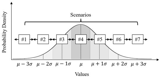 To account for variations in the volatile electricity market and the VPP’s generation output, scenarios were discretized using the Z-score method applied to the normal distributions. This method divides the continuous probability distribution into representative scenarios, effectively capturing deviations from the predicted values. Z-scores for scenario generation are selected from a set of seven integers, ranging from −3 to 3, covering approximately 99.7% of the potential deviations in a standard normal distribution, as shown in Figure 3. The scenarios for the day-ahead SMP, , and the real-time SMP, , at time are calculated using Equation (9).