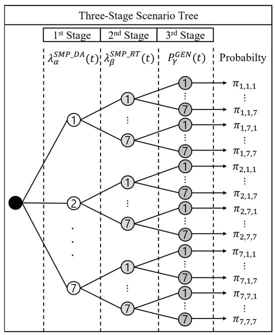 Stochastic programming, which can be efficiently solved using a scenario-based optimization approach, has been widely adopted in research to derive optimal bidding strategies for VPPs [53,54,55]. In this study, a three-stage scenario-based stochastic programming model is developed to determine the optimal VPP bidding strategy, maximizing the expected VPP profit by incorporating the probability of each scenario. This model accounts for uncertainties in the day-ahead SMP, real-time SMP, and generation output.