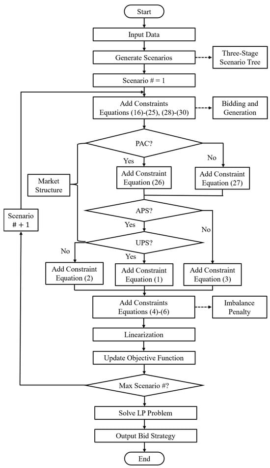 Figure 5 depicts the complete flowchart of the optimization model. This model integrates constraints related to market structure—which includes auction mechanisms and imbalance penalty structures—within a stochastic programming framework to derive the optimal bidding strategy for the VPP.