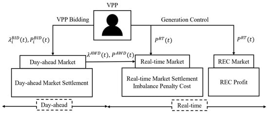 Following this, the VPP engages in generation control, adjusting electricity production based on its available resources and operational decisions. The actual real-time generation is then allocated to both the real-time electricity market and the REC market. In the real-time market, settlement is conducted with reference to the awarded day-ahead bids, with any deviations leading to imbalance penalties. Concurrently, the REC market determines additional revenue based on actual generation.