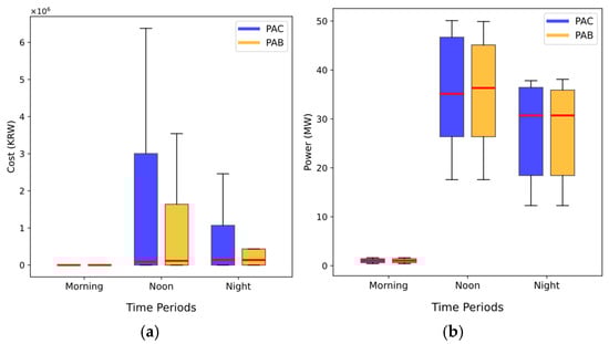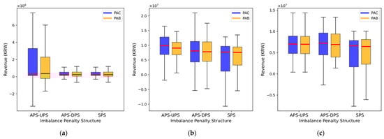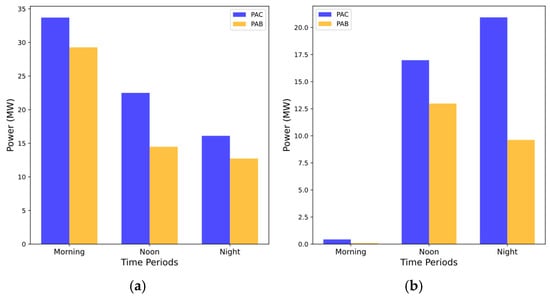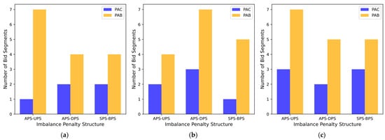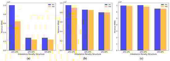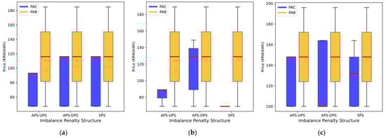 Additionally, when the SPS-BPS is applied—particularly during high- and moderate-generation periods—the PAB market effectively incurs lower imbalance penalty costs than the PAC market. As shown in Figure 14a, the penalty cost range in the PAB market is smaller, being, on average, 44.48% lower at noon and 82.32% lower at night compared to the PAC market. This demonstrates that the penalty costs are generally lower in the PAB market, resulting in more efficient and stable market operations.