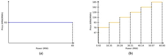 The clearing condition for the day-ahead market is based on the relationship between the bid price and the SMP. A bid is accepted if its price is lower than or equal to the SMP. Among these accepted bids, the highest bid price becomes the awarded price, and the corresponding bid quantity is awarded. To formalize this, the index is defined as the index of the bid price that satisfies the following conditions, as shown in Equation (23). If no bid satisfies this condition (i.e., all bid prices exceed the SMP), the clearing price and the awarded quantity are set to zero. The awarded day-ahead market price is defined as Equations (24). The corresponding awarded quantity is defined as Equation (25).