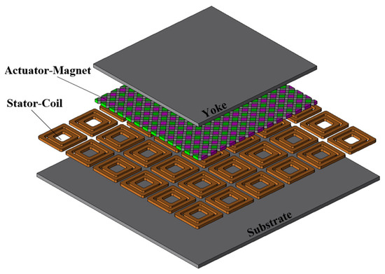 The structure of the moving magnet PMSPM optimized in this paper is shown in Figure 1, which consists of a substrate and stator coils as the primary, and Halbach PM array and yoke as the actuating parts. Each set of coils is separated into inner and outer coil units in the stator, which is a concentric combination of coils. The actuator is powered by a Halbach permanent magnet array that is two-dimensional. The array is characterized by a magnetic field that is more powerful on one side and less powerful on the other side. Unilateral enhancement occurs and has a significant impact on reducing the motor’s thrust fluctuations. It is ideal for planar motor applications and enhances its positioning accuracy [13,14,15,16,17,18,19].