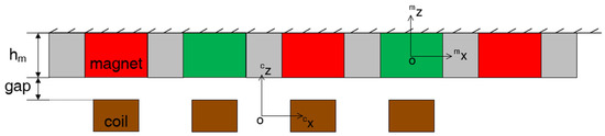 In order to define the planar motor, three coordinate systems must be used, which are the global coordinate system and two local coordinate systems. The global coordinate system is fixed. The first local coordinate system has the center of the magnet array as the origin and is denoted by the superscript m. The second local coordinate system is at the center of the coil and is denoted by the superscript c. The analytical model of the 2D Halbach PM array mentioned in this paper is shown in Figure 3.