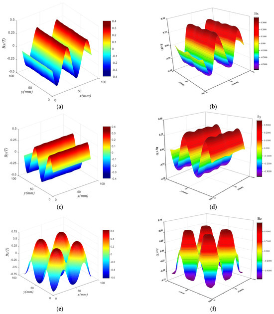 Three-dimensional mapping of the air gap flux density for the Halbach PM arrays: (a) the result of parsing Bx; (b) the result of parsing By; (c) the result of parsing Bz; (d) simulation results for By; (e) simulation results for Bx; and (f) simulation results for Bz.