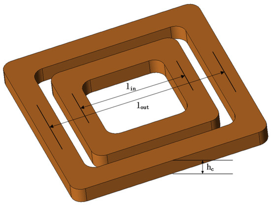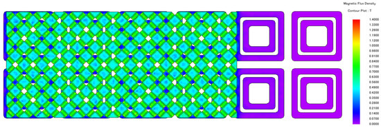 The stator of this planar motor has concentric-type coils. Each set of coils has two concentric-type coils inside and outside. Individual coils are shown in Figure 6. The actuator part is a two-dimensional array of Halbach PM. The magnet pole pitch is 22 mm. The main magnets are 14 × 14 × 10 mm cubes and the secondary magnets are 8 × 14 × 10 mm cubes. Each main magnet is surrounded by four secondary magnets. The actuator part is a two-dimensional Halbach PM array after rotating by 45 degrees. The new array has a pole pitch of mm. The range of motion of this planar motor is 300 × 300 mm. Due to the symmetry of the performance of this PMSPM in the x and y directions, the model is a 3D model and the simulation is time consuming, so to save the simulation time while guaranteeing the accuracy, the subsequent consideration is only the effect of the performance in the x direction.