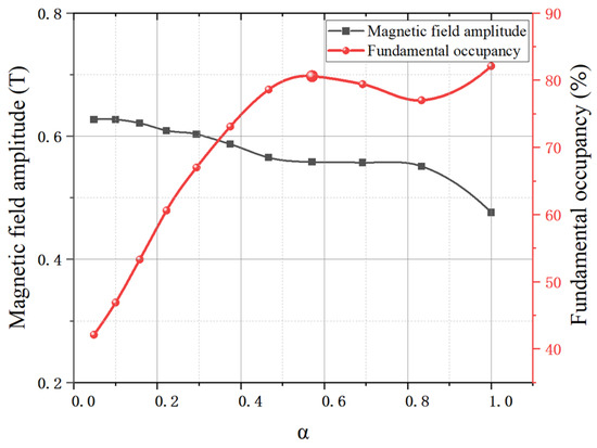 As shown in Figure 7, the air gap magnetic field strength and the base wave duty cycle for different α values are shown. Normally, the larger the magnetic field amplitude is, the larger the motor thrust is according to Equation (5). However, the magnetic field amplitude consists of the fundamental wave and the harmonics together. A single magnetic field amplitude curve cannot directly reflect the motor thrust and positioning accuracy. So, the fundamental wave occupancy is introduced to measure together. The larger the fundamental percentage is, the lower the harmonic content is, and the positioning accuracy is relatively higher. From the results, it can be seen that when α = 0.571, when the width of the main permanent magnet is 14 mm and the width of the auxiliary permanent magnet is 8 mm, the air gap magnetic field strength is larger while the base wave duty cycle is also higher.