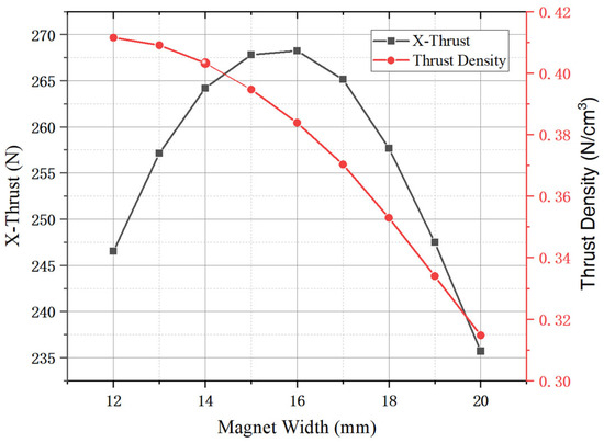The results in Figure 8 indicate that the motor thrust gradually increases with the increase in the permanent magnet thickness, but the thrust density gradually decreases with the increase in the permanent magnet thickness. Additionally, its comprehensive thrust and thrust density considerations at hm = 10 mm is the best performance of a moving magnet PMSPM, with an output thrust of 264.21 N and a thrust density of 0.403 N/cm3. Since the previous part only considered the magnetic pole size ratio on the air gap magnetic field, now the force of the motor at hm = 10 mm is considered. The width of the main permanent magnet is changed, and the results are shown in Figure 9.