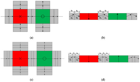 In this paper, there are four auxiliary permanent magnets around each main magnet in the two-dimensional Halbach PM array. Two main permanent magnets and seven auxiliary permanent magnets are present in an overall Halbach array cell. Inward and perpendicular to the paper, the S-pole is magnetized in red, and outside and perpendicular to the paper is magnetized in green. Additionally, the auxiliary permanent magnets are magnetized parallel to the paper from the S-pole to the N-pole in Figure 2. The width of the main permanent magnets is and the pole pitch of the magnets is .