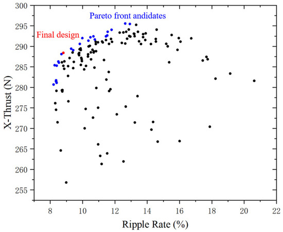 The NSGA-II algorithm’s Pareto front picture is illustrated in Figure 12. As the motor thrust increases, the inference fluctuation increases gradually. The final motor size parameters in Table 3 require us to choose an appropriate value to meet the requirements.