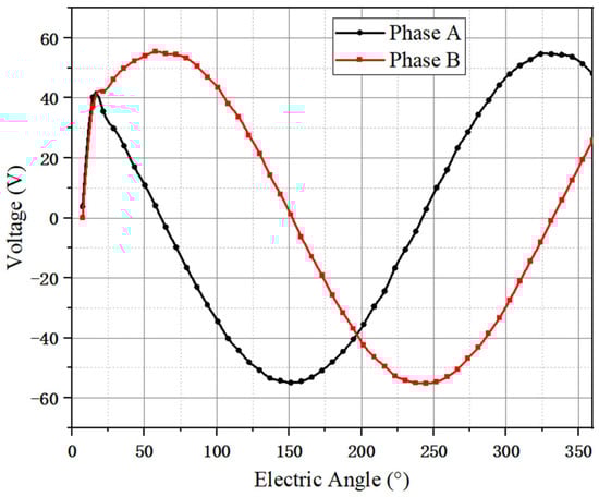 Figure 14 illustrates the counter potential of the PMSPM after optimization completion. According to the phase relationship of the two-phase windings, phase A exceeds phase B by 90°. The waveform possesses a good sinusoidal nature. The amplitude of phase A of counter potential is 54.6 V, and phase B has an amplitude of 55.4 V.
