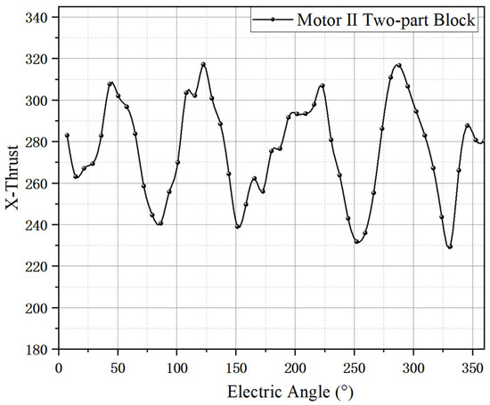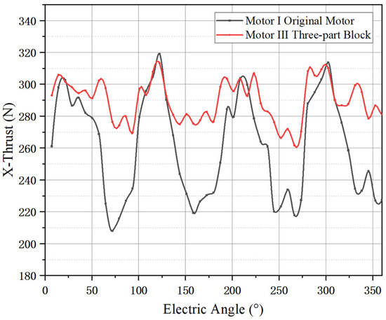 Processing the auxiliary permanent magnet in two parts leads to an output thrust of 277 N in Figure 15. In Figure 16, the output thrust values for both the initial moving magnet PMSPM and the moving magnet PMSPM after bisection of the auxiliary permanent magnets are displayed. It is known from Section 3 of this paper that the output thrust of the original motor is 264 N, with the auxiliary permanent magnets not bisected for processing. Once the temporary magnet is divided into three components, the NSGA-II algorithm is used to improve the width of the partitions and the magnetization angle. The motor III has an output thrust of 288 N, and the ripple rate of thrust dropped to 8.8%.