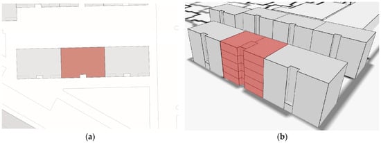 Different views of the case study. (a) Urban plant floor of the building and (b) 3D modelling where its volume, external appearance, and relationship with neighbouring buildings can be observed. Both images are part of the Sede Electrónica del Catastro [43], which is a service provided by the Spanish Government.