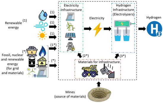 Simplified diagram of the non-renewable and renewable exergy cost of H2 via water electrolysis. The asterisk symbol * refers to the exergy costs related to non-renewable sources usage (electricity production and materials extraction).