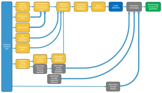Based on our assumptions, Figure 2 summarizes the algorithm adopted in this study. We evaluated the ExCOE values from 2025 to 2050 as evaluated in [35]. We split up the 14 materials’ energy intensities required for each primary energy source (PES) infrastructure, and we used LCAs to evaluate fossil fuel, nuclear energy, and renewables usages on each material extraction, refining, and manufacture [34]. These values, together with each PES capacity factor, average lifetime, conversion efficiency, EROI, and ExROI data used to model them, were used to project the electricity intensity. The IEA energy transition scenarios provided us the required, commissioned, and decommissioned power, and installed capacity from each PES for the future, whereas [44] provided us the electricity data (from 1900 to 2017) to estimate past ExCOEs (dark blue icon). Then, we collected representative data from each water electrolysis technology (material intensity, conversion efficiency and lifetime) [7,14,36,37] to represent their average behavior for each studied year and by applying the ExCOE, we were able to estimate overall exergy costs of hydrogen under such circumstances, as is detailed in the subsequent sections.