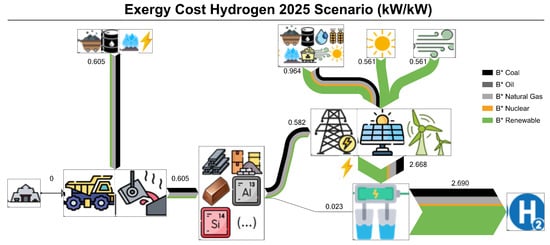 As an illustrative example, we chose an alkaline water electrolysis (AWE) solar-PV-fed system in 2025 under the NZE scenario as an illustrative example of how to evaluate the green hydrogen overall exergy cost in this work. The first step involves evaluating the electrolysis (process) requirement to produce 1 MJ of hydrogen (unit: MJ/MJH2) via Equation (1). In this case, however, the electricity power (assuming electrical energy as pure exergy) not only includes meeting electricity demand but also the exergy costs required to build the primary energy source (PES) infrastructures that provide the electricity grid [35]. While fossil fuel sources and infrastructure do not present a significant contribution to their electricity production costs (via their EROI and ExROI), this is not the case for renewable energy sources. These demand materials that have very energy-intensive origins (e.g., refined silicon for PV) or require significantly large amounts (e.g., stainless steel and concrete for wind and hydro, respectively).