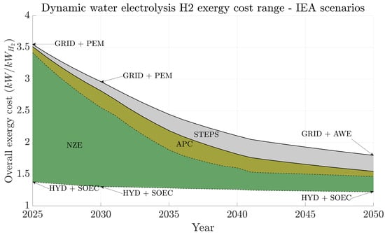 Figure 4 summarizes the overall exergy cost of producing H2 under three IEA projections from 2025 up to 2050, fourteen electricity production scenarios and four water electrolysis technologies. We compacted all possible results in surface areas for each IEA projection. For example, the green area represents all possible exergy cost values that all studied technologies provide throughout the years. The same interpretation can be given to APC (dark yellow) and STEPS scenarios; what occurs is simply area overlap (the green area overlapping the dark yellow one, which overlaps the gray one). Therefore, the NZE scenario presents the lowest exergy cost range throughout the studied period. Moreover, 2025’s overall exergy costs range between (for the HYD + SOEC combination) and 3.41 kW/kWH2 (for the GRID + PEM combination), whereas in 2050, they will depend on the energy transition scenario. The NZE case presents the highest exergy cost reduction (smallest area), which ranges between and 1.47 kW/kWH2, while the APC and STEPS maximum values are and 1.79 kW/kWH2, respectively. The bottom part of all three areas is covered by fully renewable production systems (hydro presents the lowest exergy costs). Therefore, depending on how the energy transition scenario takes place, there might be at least a 17.8% overall exergy cost difference (between maximum cost values). This finding indicates that the energy transition rate will dictate the amount of wasted exergy to produce hydrogen and, therefore, how renewable and sustainable this production might become over the years (without even including proper recycling of end-of-life electrolyzer materials).