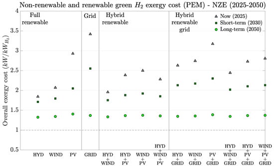 Calculating the exergy cost of electricity is more challenging compared to hydrogen. The reason is that electricity itself is an indispensable resource for the production of the infrastructure that generates electricity. Thus, the study of the cost of electricity is a dynamic process. This process has been studied previously [35], considering the chemical exergy of minerals, the ore grade declining of major metals for producing the electricity infrastructure, and the decrease in material intensity as a result of technological development. Thus, the electricity produced in a selected year is used to produce the following year’s infrastructure. Therefore, the more renewable energy is installed, the more renewable electricity is used in the manufacturing of the new infrastructure, accelerating decarbonization. Table 4 shows the results of the exergy cost of the electricity considering this aforementioned dynamic process by assuming different scenarios. We consider three different projections based on the IEA Scenarios, NZE, APC, and STEPS [39,40], which are evaluated for 2025 (current), 2030 (short term), and 2050 (long term). Furthermore, as stated in the introduction, we consider combinations of four different technologies: hydro (HYD), wind (WIND), photovoltaic (PV), and the electrical grid (GRID).