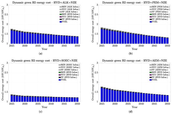 Dynamic non-renewable and renewable H2 exergy costs up to 2050 under the IEA NZE scenario (HYD + electrolyzers). Exergy costs are split up between the electrolyzer efficiency, the energy source used on the PES, and electrolyzer infrastructures. (a) AWE. (b) PEM. (c) SOEC. (d) AEM.