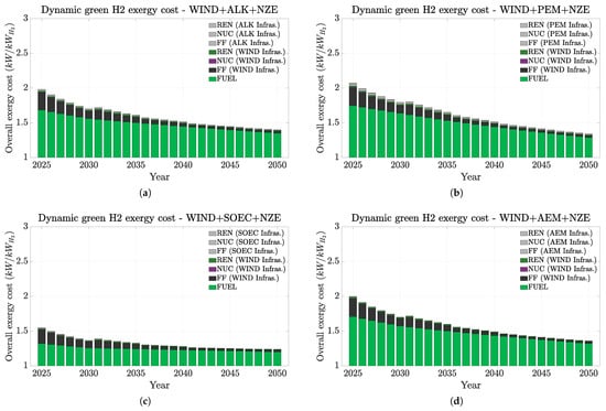 The exergy cost of hydrogen due to electricity generation is calculated dividing the exergy cost of electricity for each electricity scenario by the efficiencies of each electrolyzer technology (), as shown by Equation (1). It is important to remember that already contains all the information regarding the life cycle of each renewable energy source (e.g., the capacity factor, the lifetime, and the cost of the infrastructure). has 3 components: (1) fuel (it is renewable when electricity is produced from a renewable technology, sunlight, potential energy of water, or wind, whereas it is non-renewable when electricity is produced from a non-renewable source, such as fossil fuels or nuclear energy); (2) non-renewable exergy cost of the infrastructure; (3) renewable exergy cost of the infrastructure. Therefore, is also disaggregated into these 3 components.