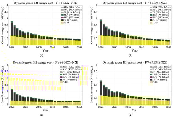 Dynamic non-renewable and renewable H2 exergy costs up to 2050 under the IEA NZE scenario (PV + electrolyzers). Exergy costs split up between the electrolyzer efficiency, and energy source used on the PES and electrolyzer infrastructures. (a) AWE. (b) PEM. (c) SOEC. (d) AEM.