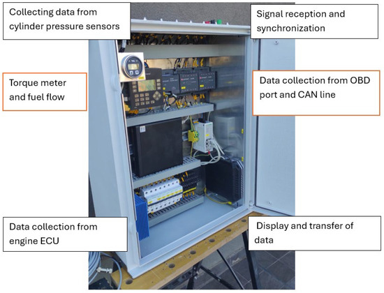 For the experimental research, an expert system with the possibility for remote monitoring (Figure 1) has been developed and implemented on a ferry with four-stroke marine diesel engines during its voyage. The system provides online access to key ship parameters. The sensors on board are connected to the monitoring system. The sensors are either wired or wireless and monitor various systems (e.g., engine, battery charge level, fuel tank level, engine room temperatures, battery temperatures and more). An Internet connection with secure and encrypted communication is used for sending data to a server located in a laboratory for heat engines. An expert system installed on a server analyses the received data in order to, for example, predict engine component failures or provide insights into other features of the ship’s navigation and exploitation. Engine and ship data are available to the experts with a secure user account accessible via smartphone or computer. The user can grant access to third parties such as maintenance companies to facilitate cooperation with their service providers.