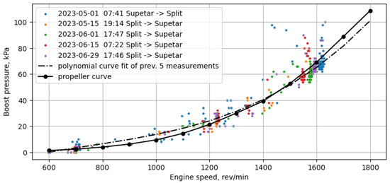 Boost pressure is important for maximizing the economy. By compressing intake air, boost pressure raises air density, which allows for more fuel combustion and produces more power. In high-speed marine engines, boost pressure is carefully regulated, guaranteeing peak performance under various loads and speeds. In non-steady conditions, measurements are more scattered because other parameters can also affect the boost pressure. In near-steady conditions, when cruising speed is achieved and with good conditions at sea, boost pressure should depend primarily on engine speed, as in the manufacturer data for the propeller curve.