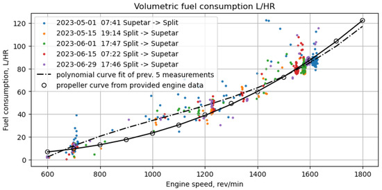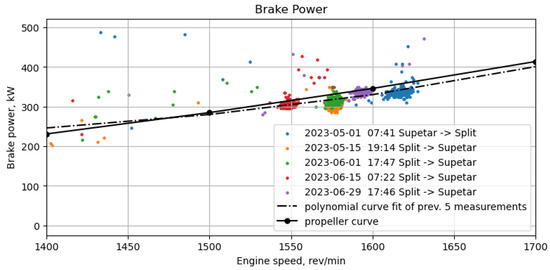 Figure 4 shows the dependency of the brake power on the engine speed. The data points in different colors represent a different set of measurements. Each trip has a characteristic speed that is maintained during navigation, which probably depends to a significant extent on the weather conditions.