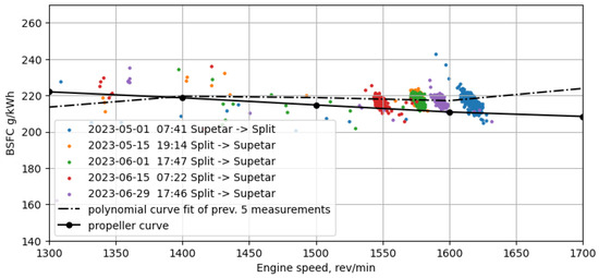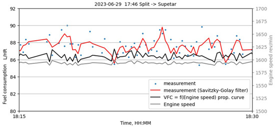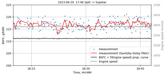 Figure 6 shows the brake-specific consumption during ferry navigation. The Savitz-ky–Golay filter is applied to the measurement data points to better visualize trends. The curve shows constant changes in consumption because the engine does not work with a continuous load. The load on the engine is constantly changing in order to maintain the direction of the ferry, especially in rough seas and bad weather conditions.
