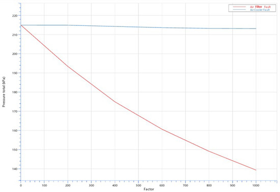 Figure 10 illustrates the intake manifold air pressure drop as a function of severe clogging. The red curve represents the air filter blockage, with values ranging from a clean filter (factor 0) to a fully blocked filter (factor 1000). The blue curve shows the pressure drop due to air cooler blockage. It is clear that when simulating air filter contamination, the pressure in the intake manifold drops drastically because the factor through which we simulate contamination is directly related to the air flow through the filter towards the intake manifold. This is determined according to Equations (1)–(3).